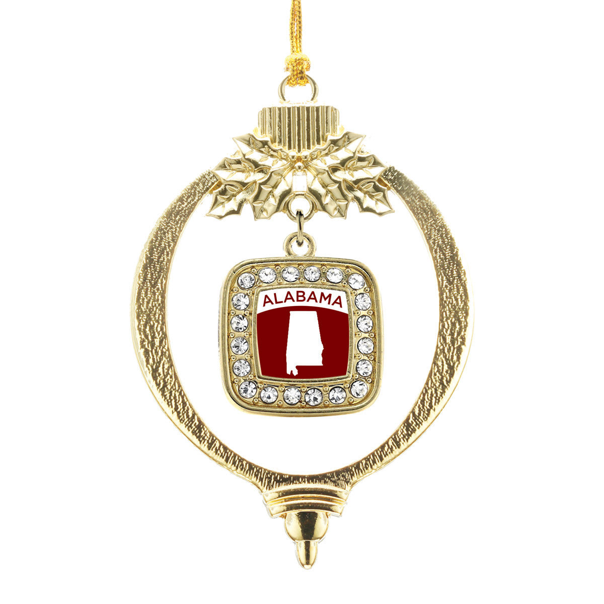Our sparkling holiday ornament, equipped with a stylish silver rope and the Alabama Outline square charm, is crafted from white metal with a gold plated finish and accented with cubic zirconia stones.