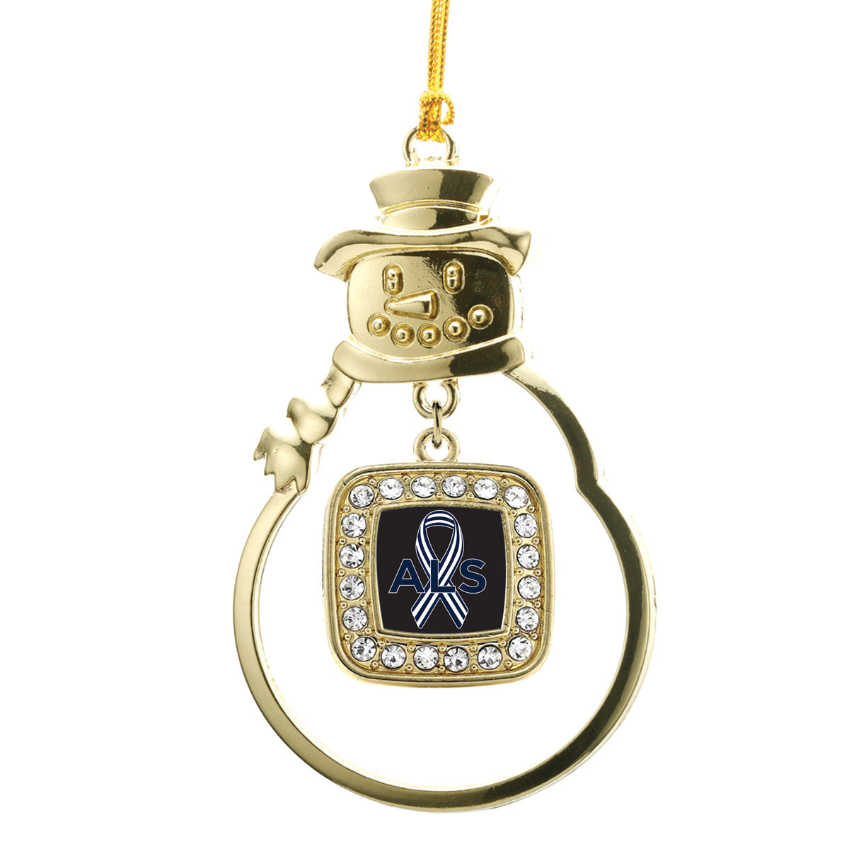 Our sparkling snowman ornament, equipped with a stylish silver rope and the ALS Awareness square charm, is crafted from white metal with a gold plated finish and accented with cubic zirconia stones.