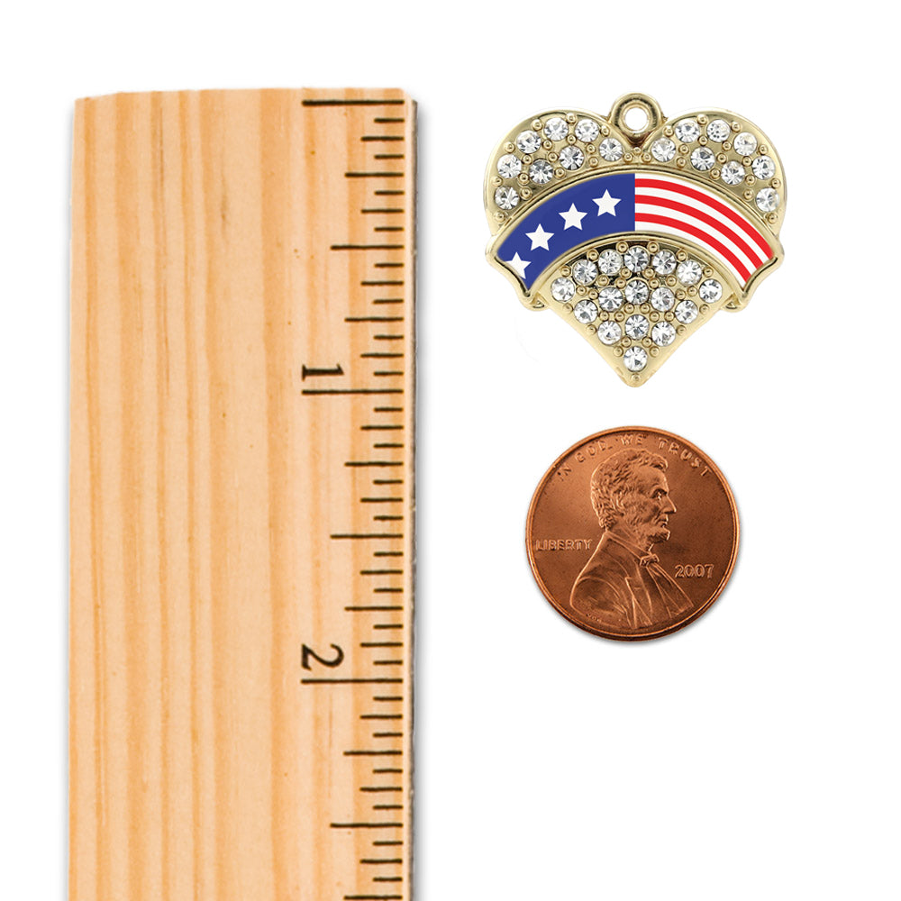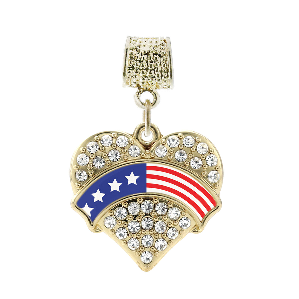 Our sparkling memory charm, equipped with a stylish charm attachment ring and the American Flag pave heart charm, is crafted from white metal with a gold plated finish and accented with cubic zirconia stones.