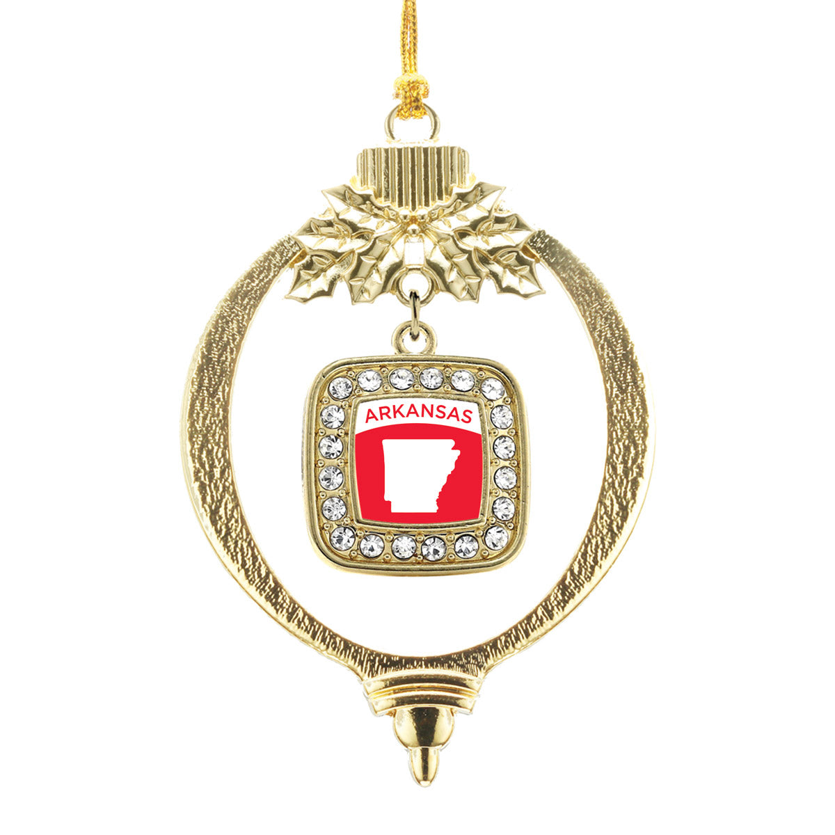 Our sparkling holiday ornament, equipped with a stylish silver rope and the Arkansas Outline square charm, is crafted from white metal with a gold plated finish and accented with cubic zirconia stones.