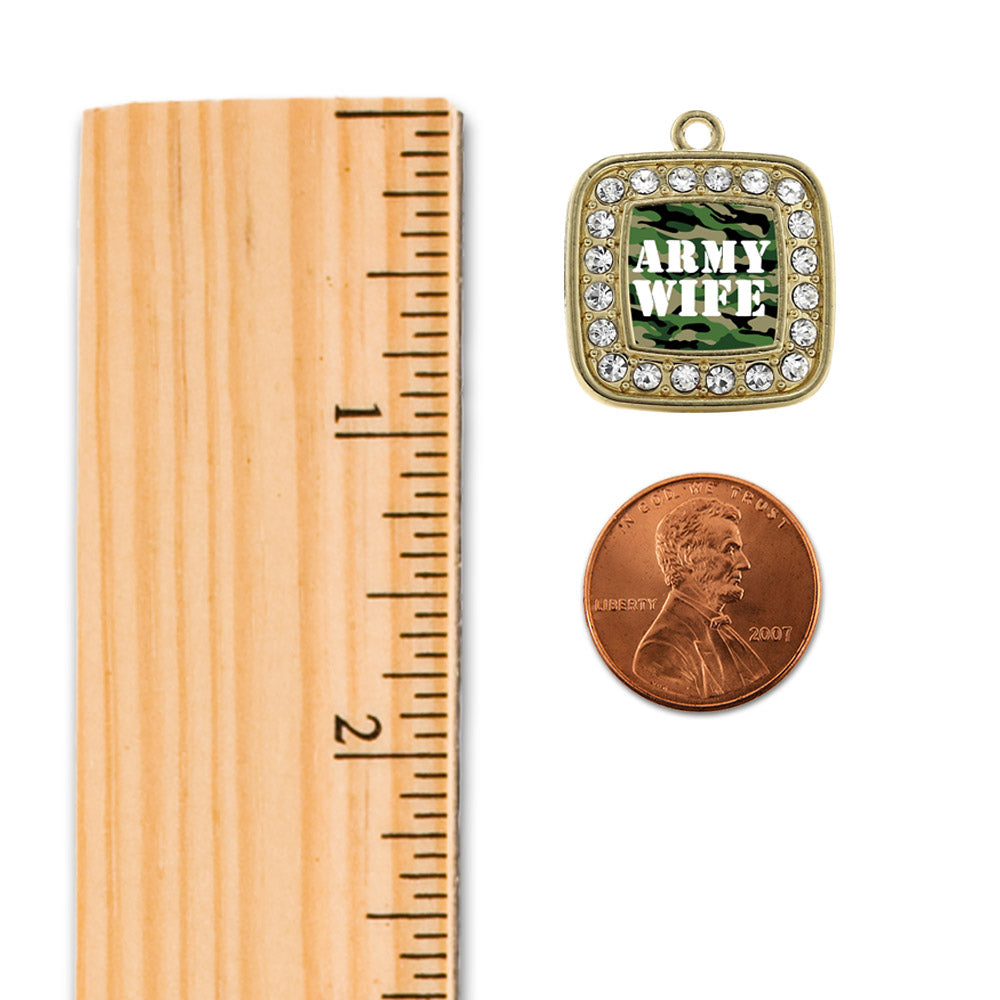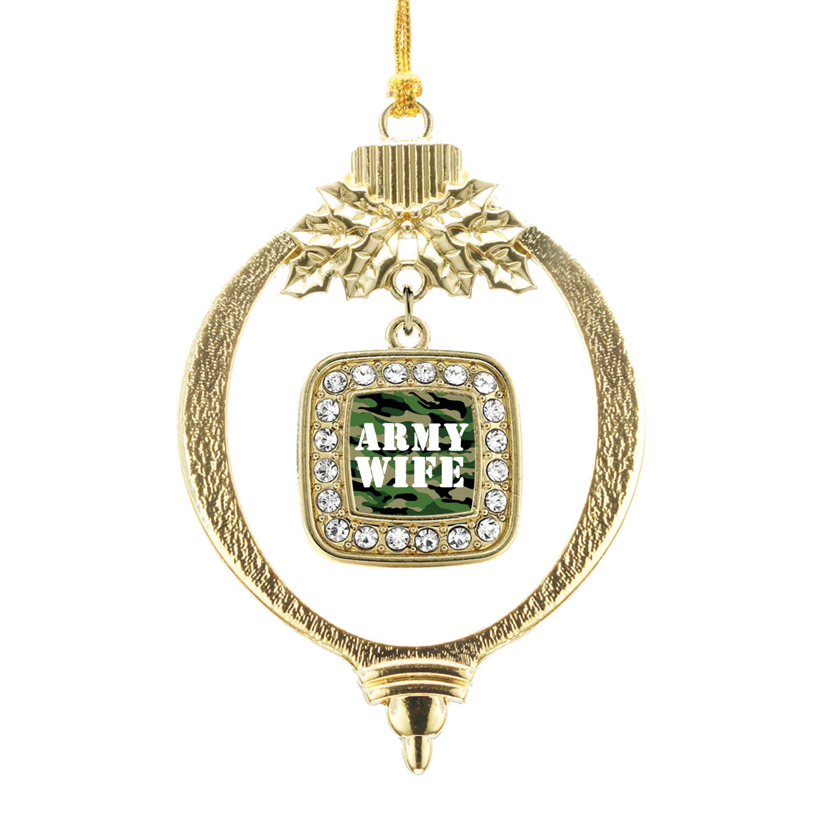 Our sparkling holiday ornament, equipped with a stylish silver rope and the Army Wife square charm, is crafted from white metal with a gold plated finish and accented with cubic zirconia stones.