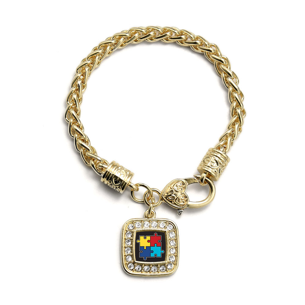 Our sparkling braided bracelet, equipped with a stylish lobster claw clasp and the Autism Awareness Jigsaw square charm, is crafted from white metal with a gold plated finish and accented with cubic zirconia stones.