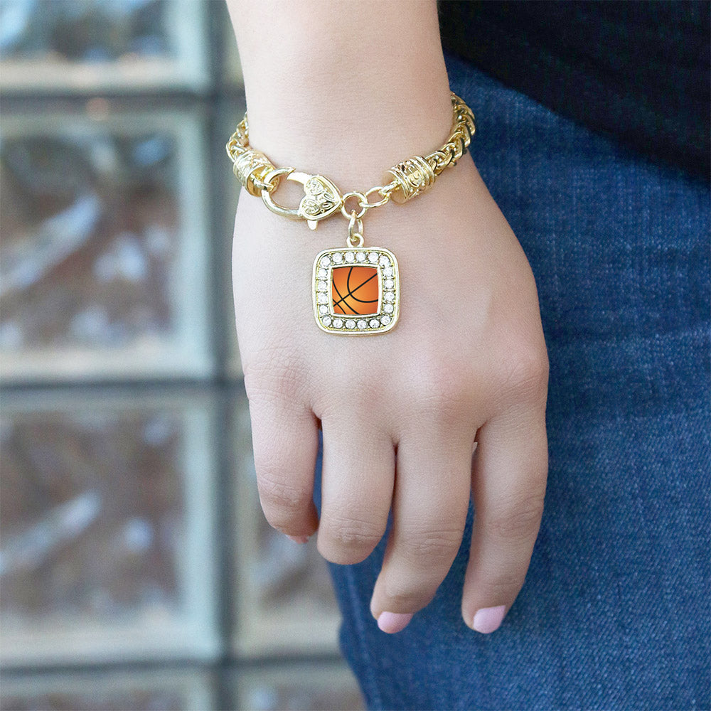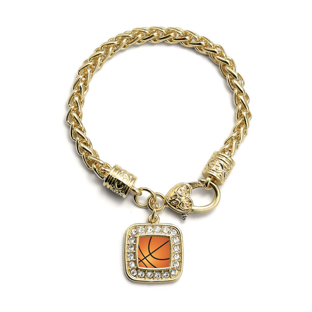 Our sparkling braided bracelet, equipped with a stylish lobster claw clasp and the Basketball square charm, is crafted from white metal with a gold plated finish and accented with cubic zirconia stones.