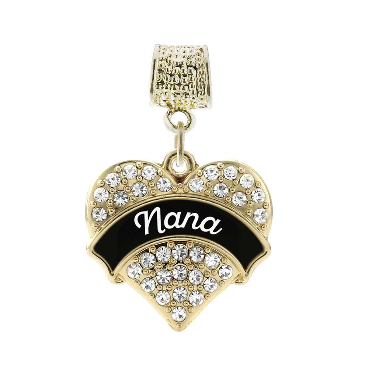Our sparkling memory charm, equipped with a stylish charm attachment ring and the Black and White Nana pave heart charm, is crafted from white metal with a gold plated finish and accented with cubic zirconia stones.