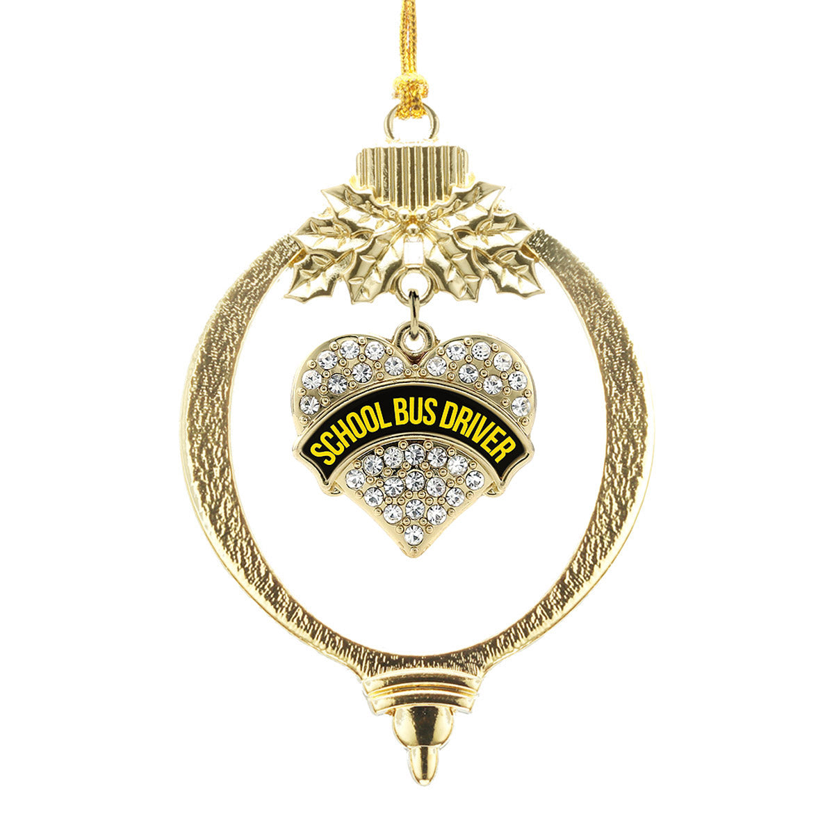 Our sparkling holiday ornament, equipped with a stylish silver rope and the Black and Yellow School Bus Driver pave heart charm, is crafted from white metal with a gold plated finish and accented with cubic zirconia stones.