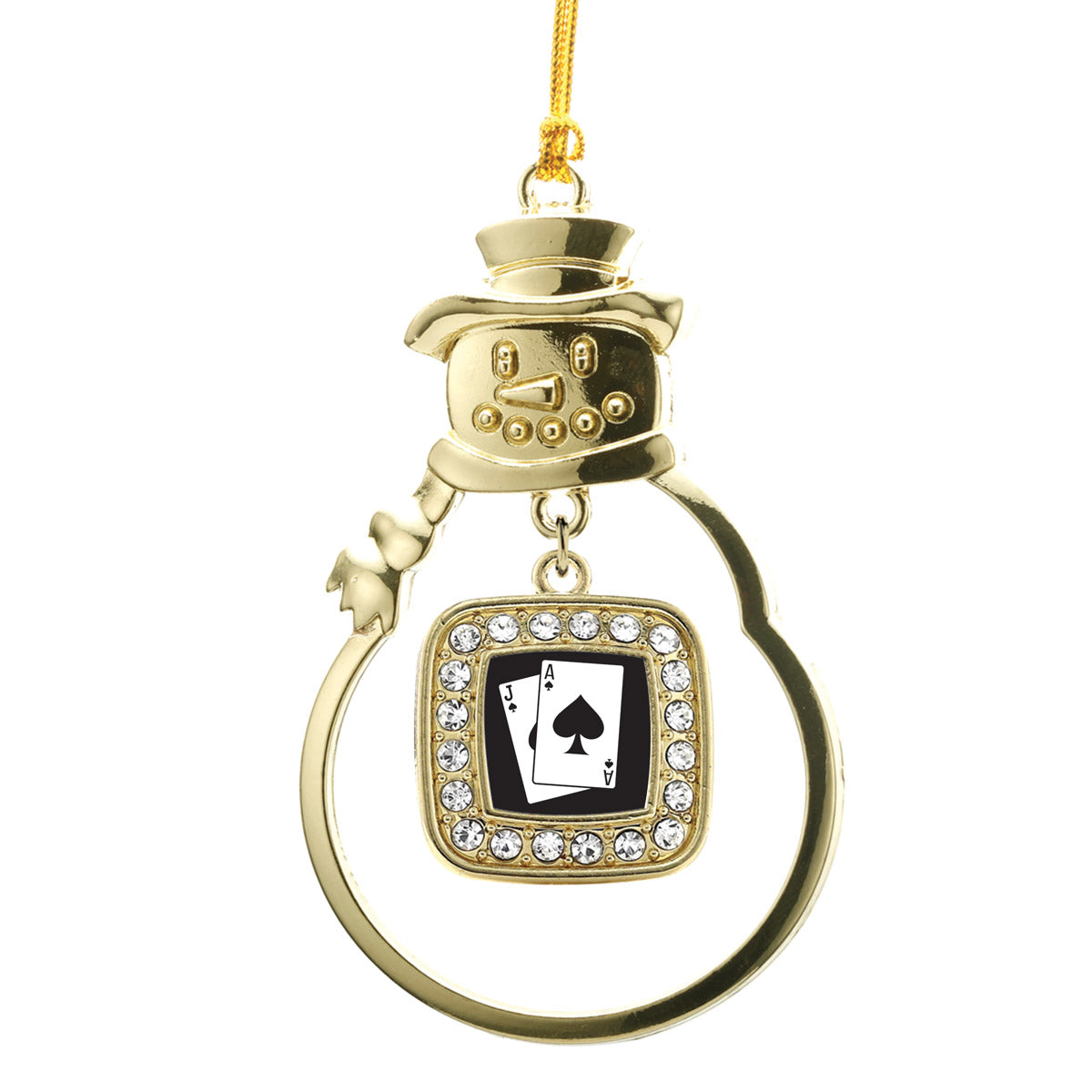 Our sparkling snowman ornament, equipped with a stylish silver rope and the Blackjack square charm, is crafted from white metal with a gold plated finish and accented with cubic zirconia stones.