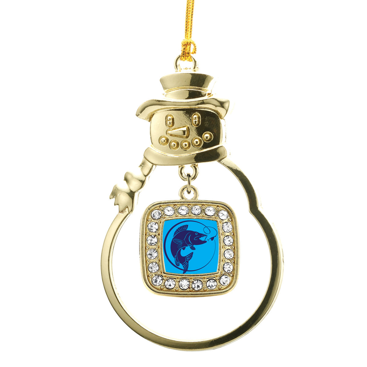 Our sparkling snowman ornament, equipped with a stylish silver rope and the Blue Fishing square charm, is crafted from white metal with a gold plated finish and accented with cubic zirconia stones.