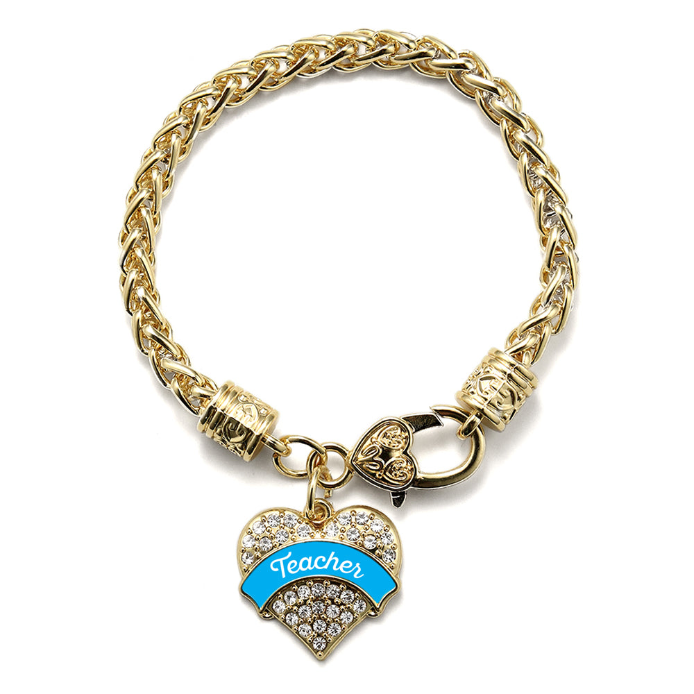 Our sparkling braided bracelet, equipped with a stylish lobster claw clasp and the Blue Teacher pave heart charm, is crafted from white metal with a gold plated finish and accented with cubic zirconia stones.