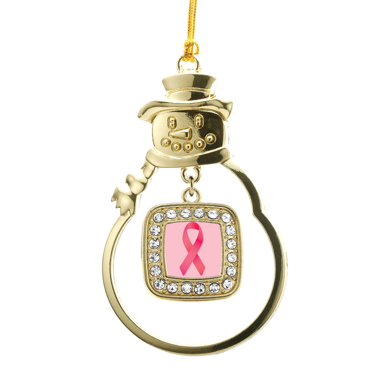 Our sparkling snowman ornament, equipped with a stylish silver rope and the Breast Cancer square charm, is crafted from white metal with a gold plated finish and accented with cubic zirconia stones.
