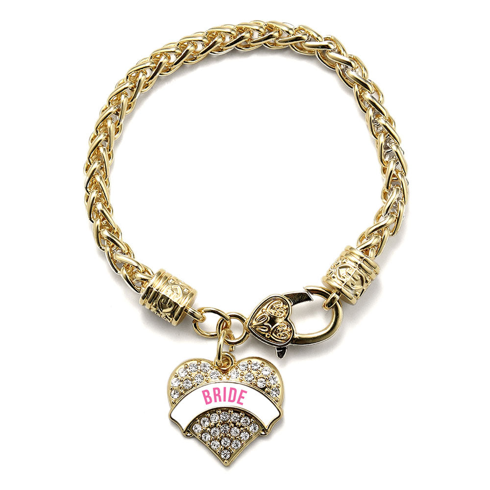 Our sparkling braided bracelet, equipped with a stylish lobster claw clasp and the BRIDE pave heart charm, is crafted from white metal with a gold plated finish and accented with cubic zirconia stones.