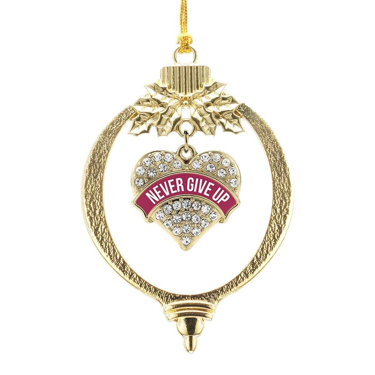 Gold Burgundy Banner Never Give Up Pave Heart Charm Holiday Ornament