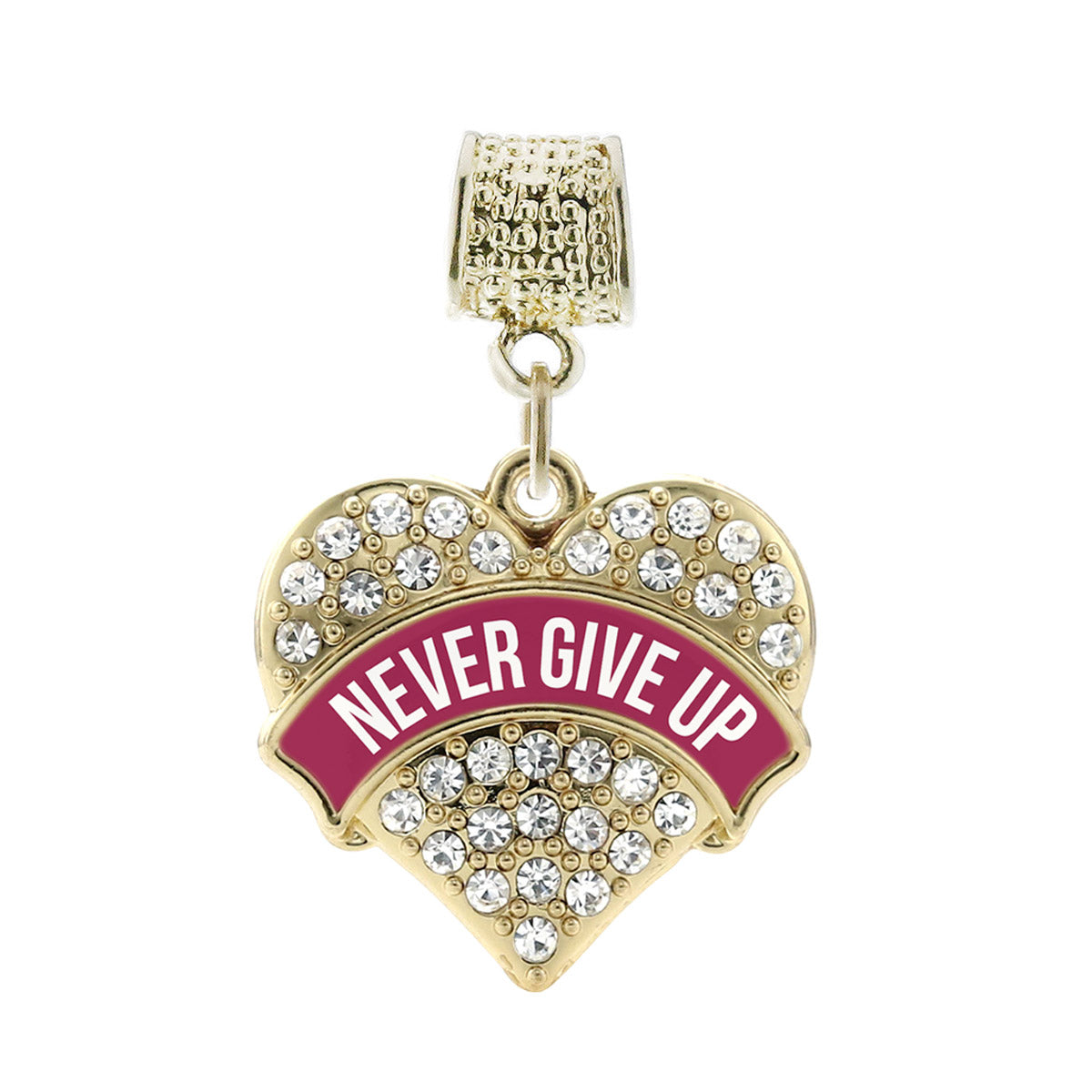 Gold Burgundy Banner Never Give Up Pave Heart Memory Charm