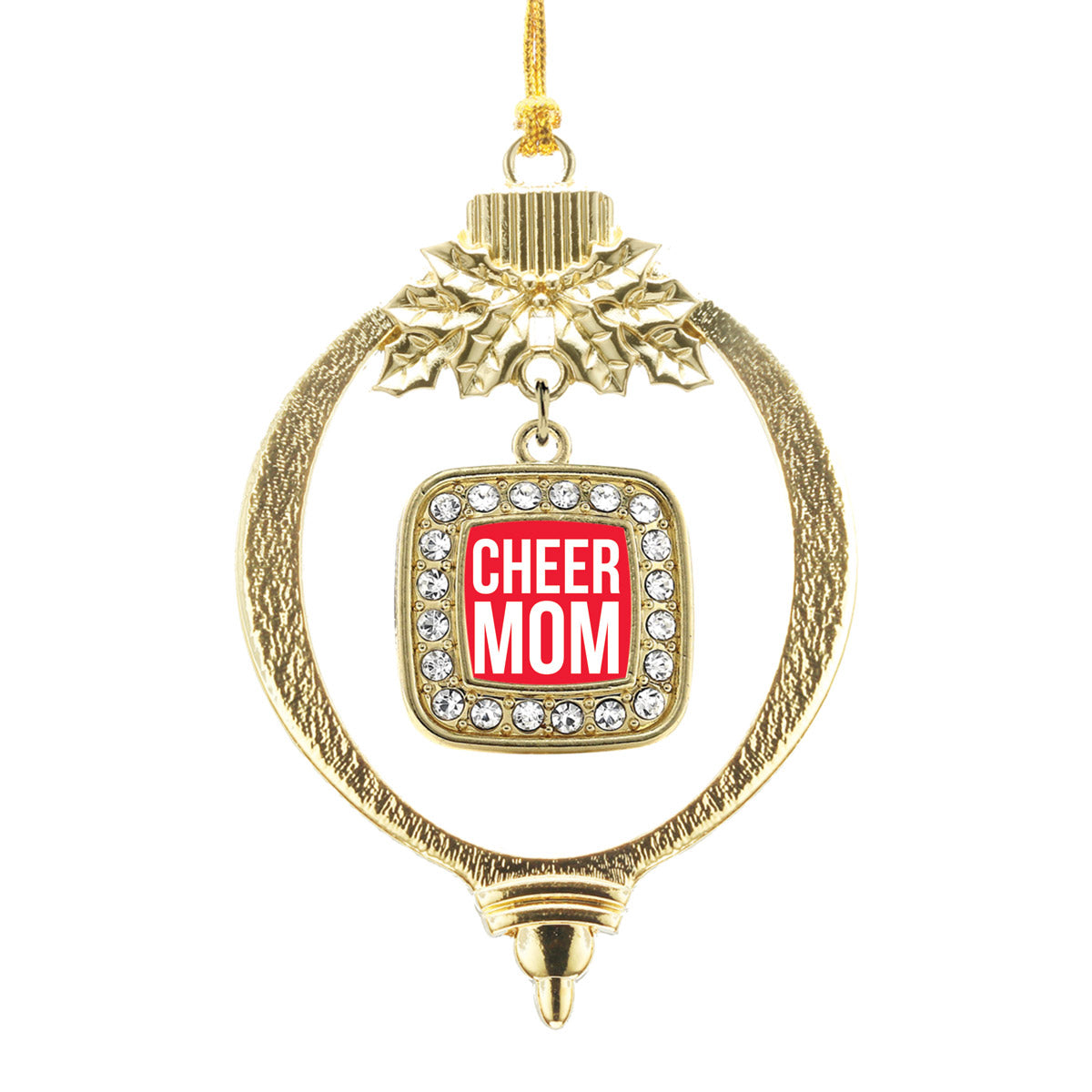 Our sparkling holiday ornament, equipped with a stylish silver rope and the Cheer Mom square charm, is crafted from white metal with a gold plated finish and accented with cubic zirconia stones.