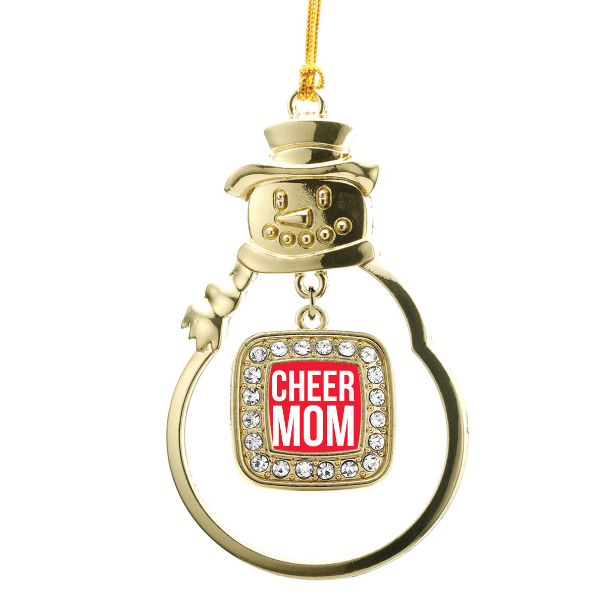 Our sparkling snowman ornament, equipped with a stylish silver rope and the Cheer Mom square charm, is crafted from white metal with a gold plated finish and accented with cubic zirconia stones.