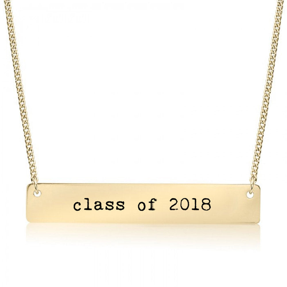 Our sparkling bar necklace, equipped with a stylish lobster claw clasp and the Class of 2018 bar charm, is crafted from white metal with a gold plated finish.