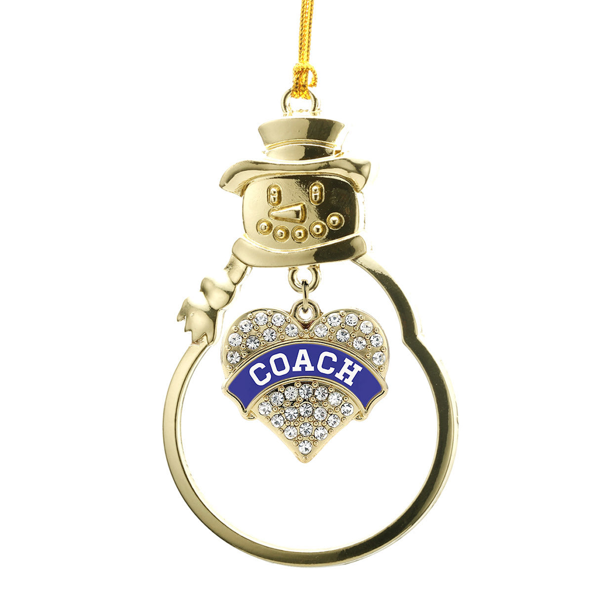 Our sparkling snowman ornament, equipped with a stylish silver rope and the Coach - Blue and White pave heart charm, is crafted from white metal with a gold plated finish and accented with cubic zirconia stones.