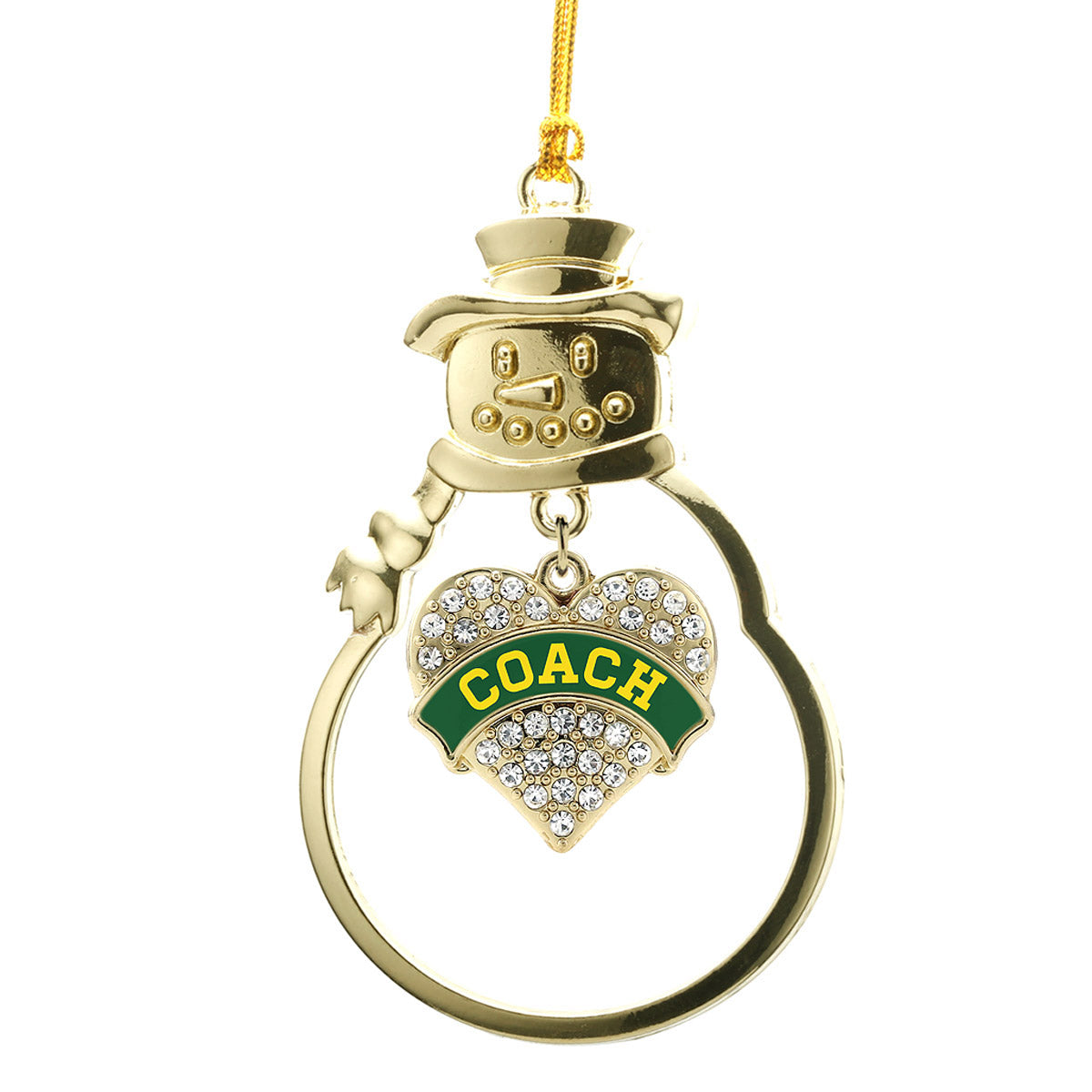 Our sparkling snowman ornament, equipped with a stylish silver rope and the Coach - Forest Green and Yellow pave heart charm, is crafted from white metal with a gold plated finish and accented with cubic zirconia stones.