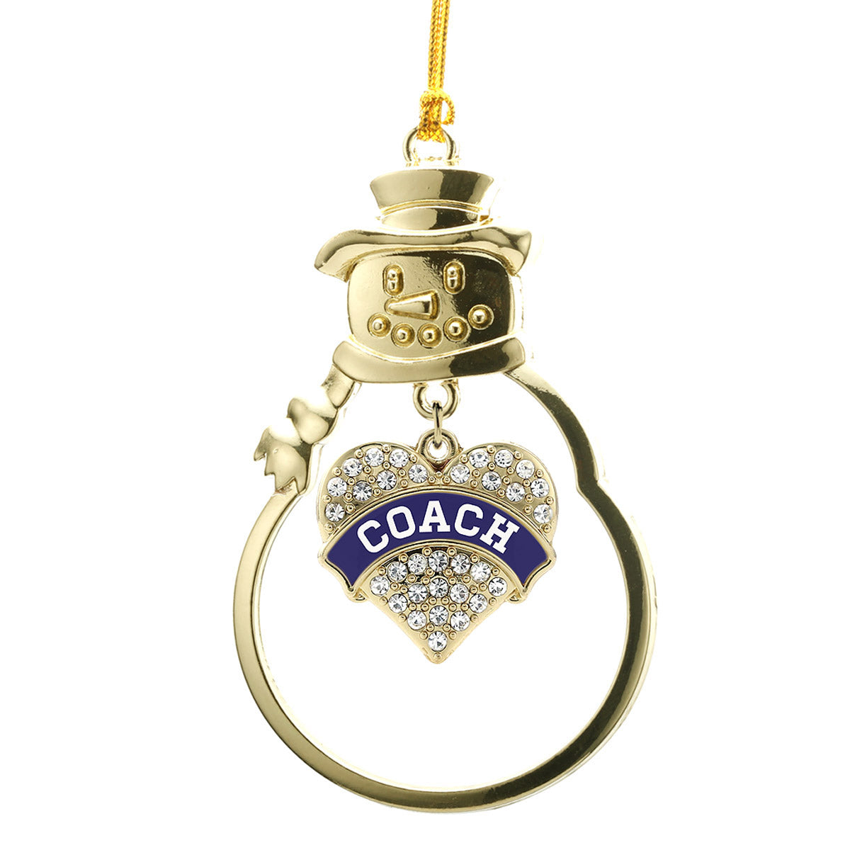 Our sparkling snowman ornament, equipped with a stylish silver rope and the Coach - Navy Blue and White pave heart charm, is crafted from white metal with a gold plated finish and accented with cubic zirconia stones.