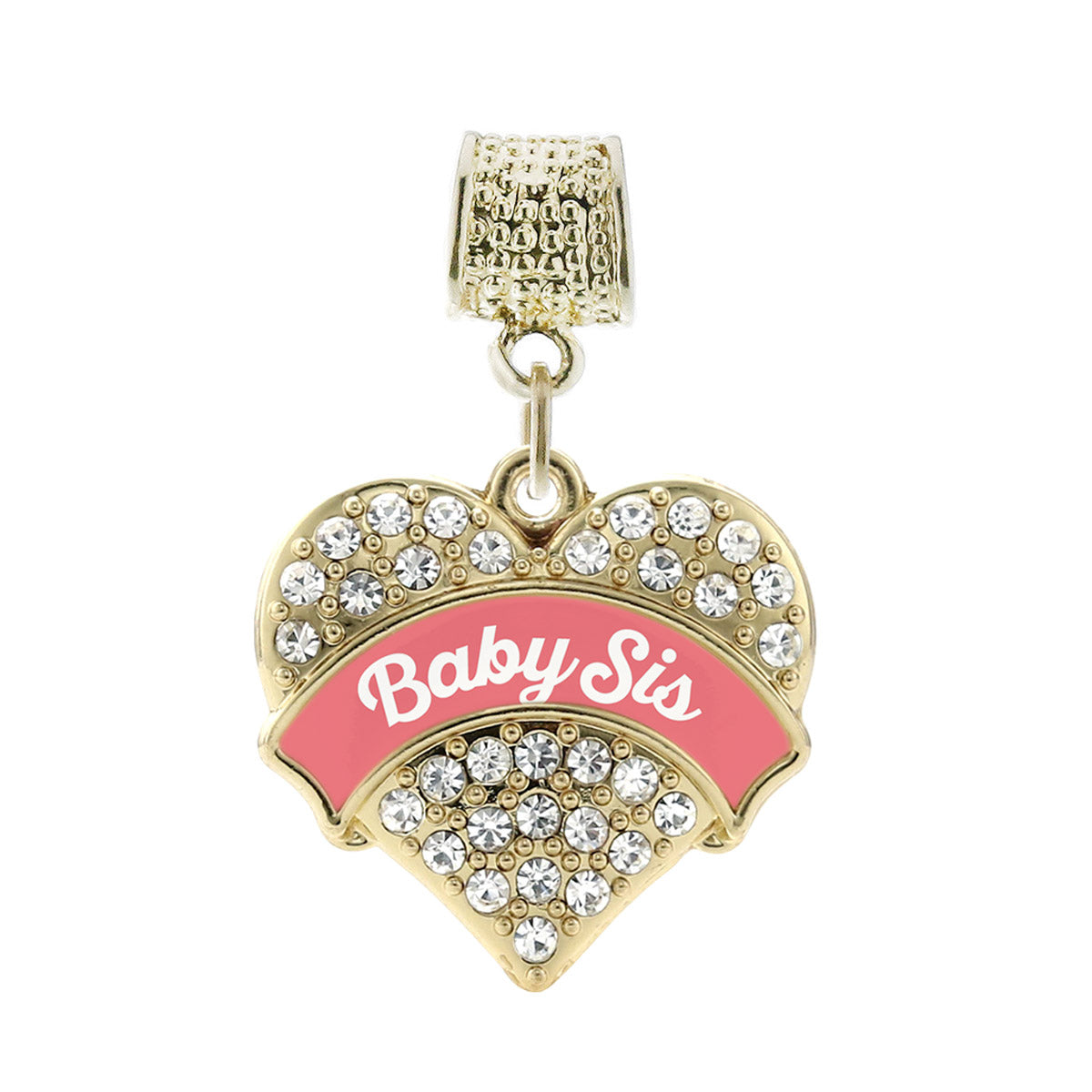 Our sparkling memory charm, equipped with a stylish charm attachment ring and the Coral Baby Sister pave heart charm, is crafted from white metal with a gold plated finish and accented with cubic zirconia stones.