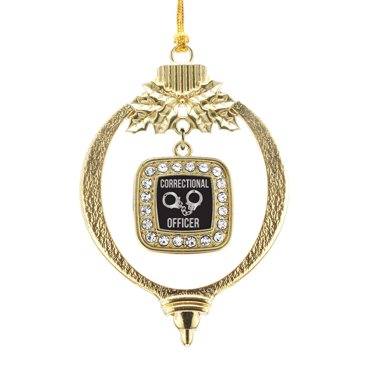 Our sparkling holiday ornament, equipped with a stylish silver rope and the Correctional Officer square charm, is crafted from white metal with a gold plated finish and accented with cubic zirconia stones.