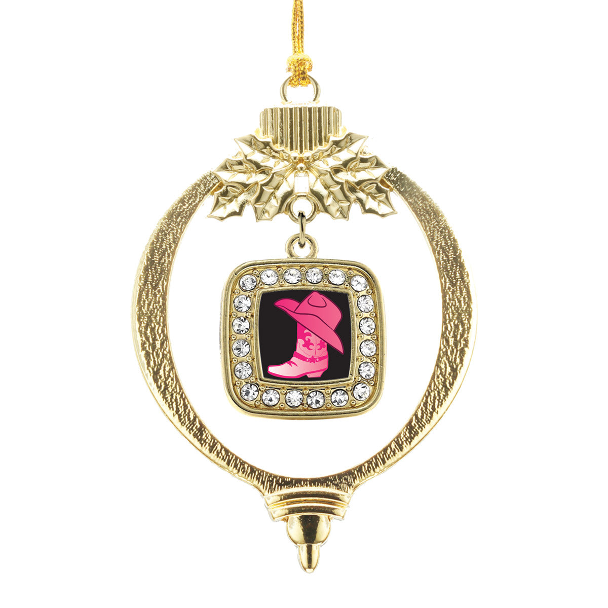 Our sparkling holiday ornament, equipped with a stylish silver rope and the Cowgirl Boot square charm, is crafted from white metal with a gold plated finish and accented with cubic zirconia stones.