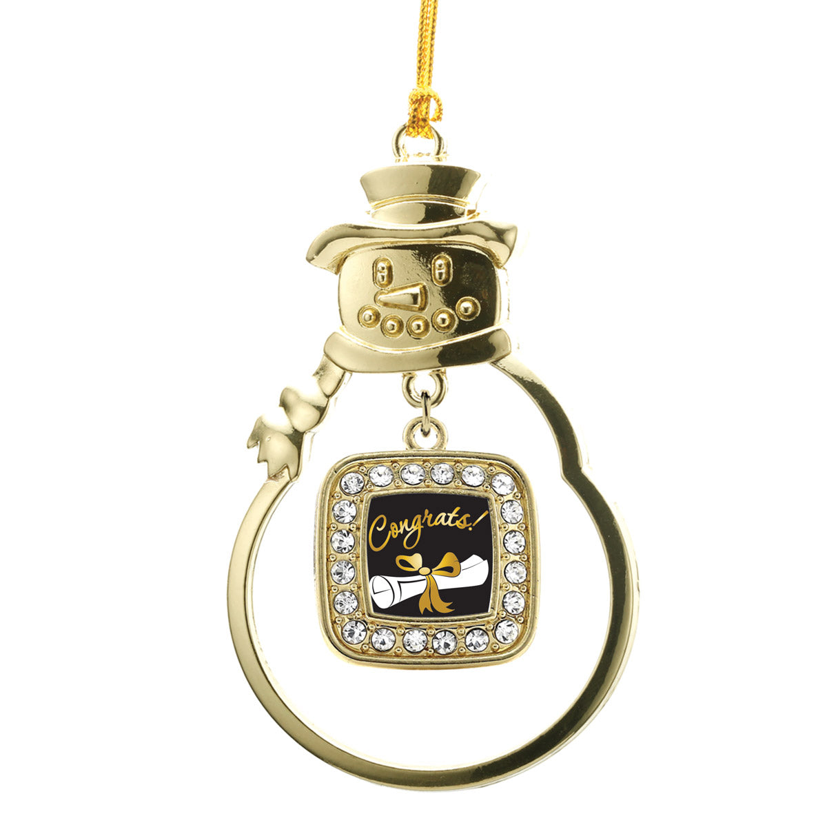 Our sparkling snowman ornament, equipped with a stylish silver rope and the Diploma square charm, is crafted from white metal with a gold plated finish and accented with cubic zirconia stones.