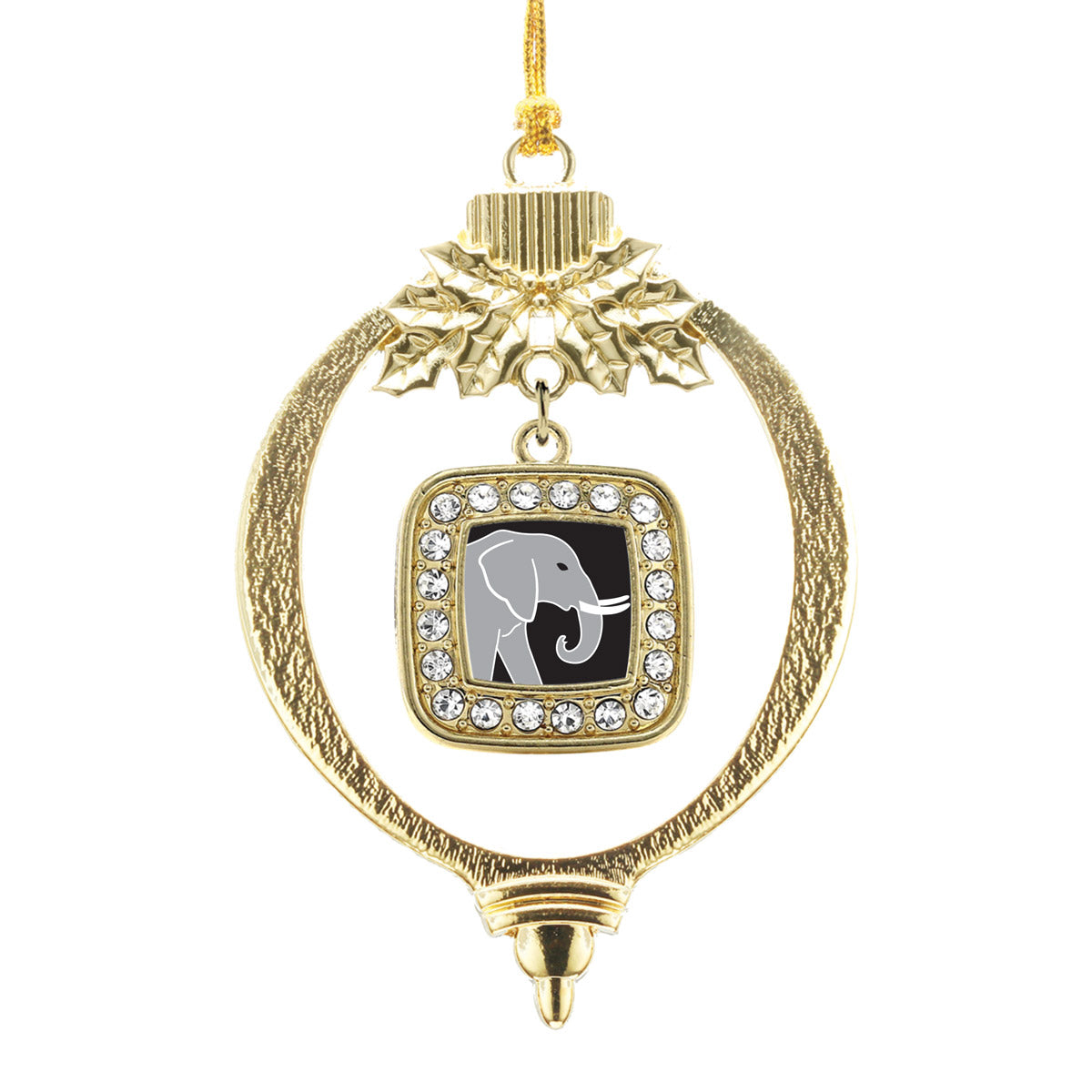 Our sparkling holiday ornament, equipped with a stylish silver rope and the Elephant square charm, is crafted from white metal with a gold plated finish and accented with cubic zirconia stones.
