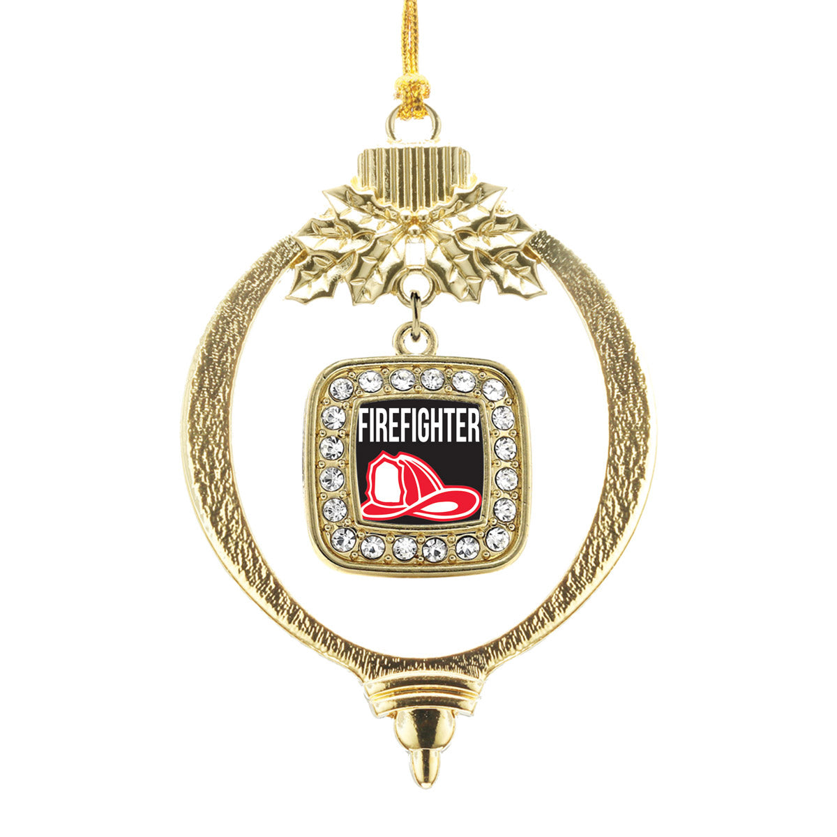 Our sparkling holiday ornament, equipped with a stylish silver rope and the Firefighter square charm, is crafted from white metal with a gold plated finish and accented with cubic zirconia stones.