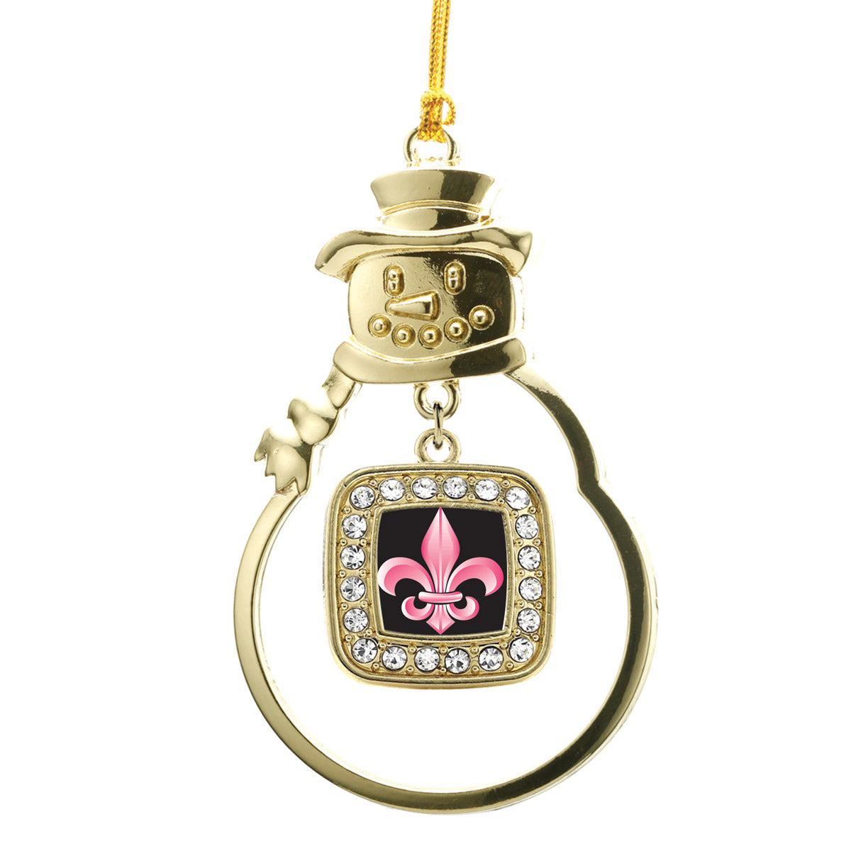 Our sparkling snowman ornament, equipped with a stylish silver rope and the Fleur De Lis square charm, is crafted from white metal with a gold plated finish and accented with cubic zirconia stones.