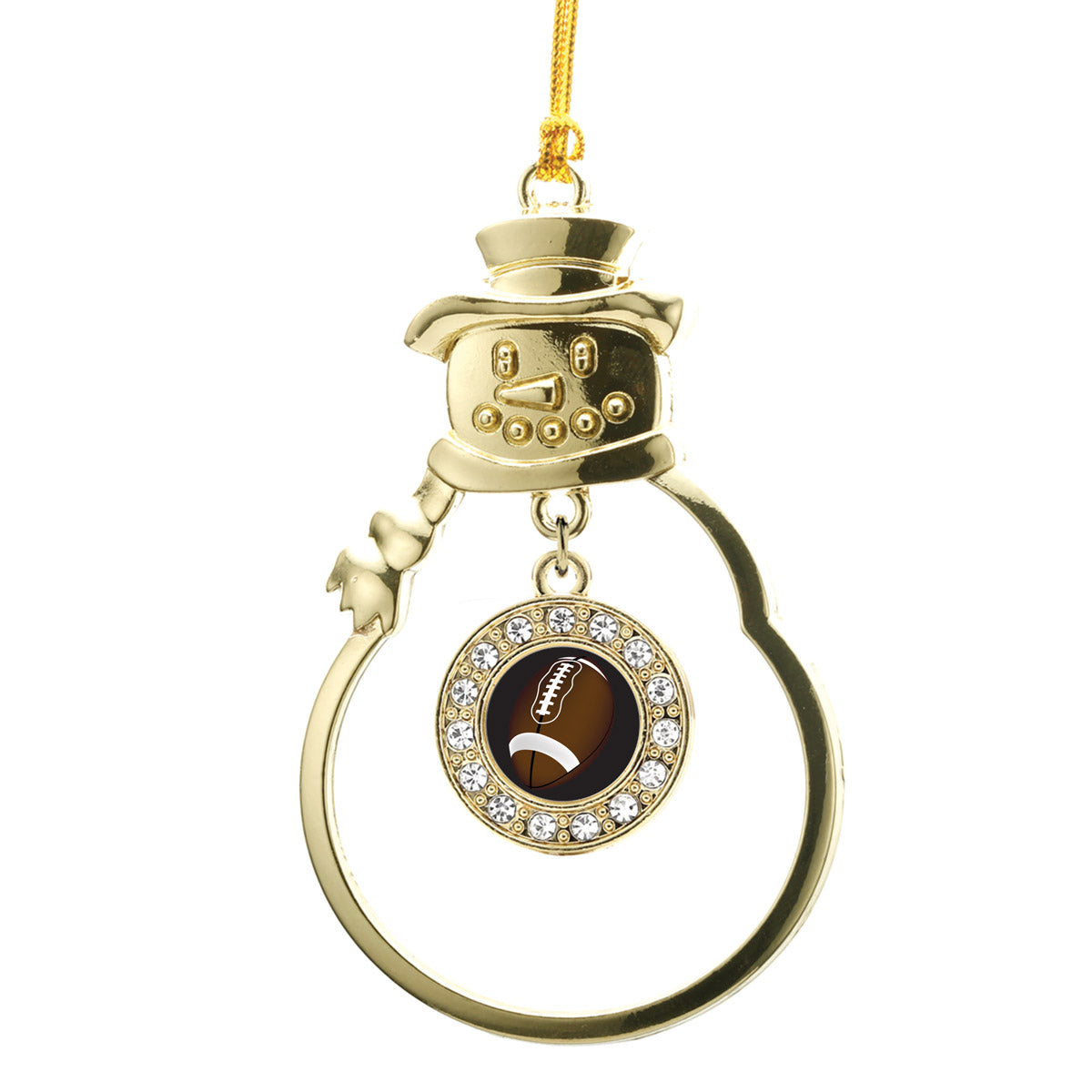 Our sparkling snowman ornament, equipped with a stylish silver rope and the Football Lovers circle charm, is crafted from white metal with a gold plated finish and accented with cubic zirconia stones.