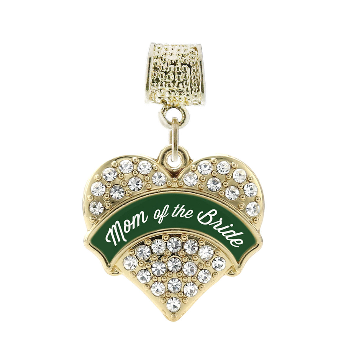 Our sparkling memory charm, equipped with a stylish charm attachment ring and the Forest Green Mom of Bride pave heart charm, is crafted from white metal with a gold plated finish and accented with cubic zirconia stones.