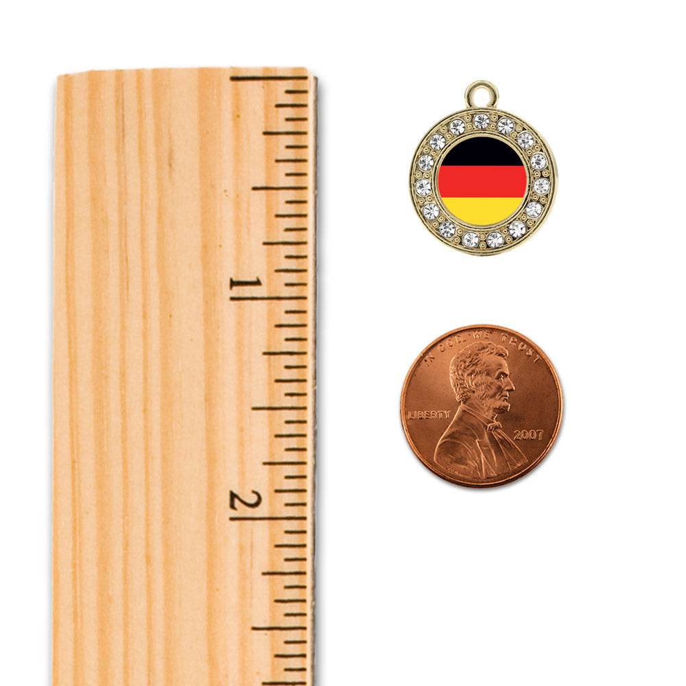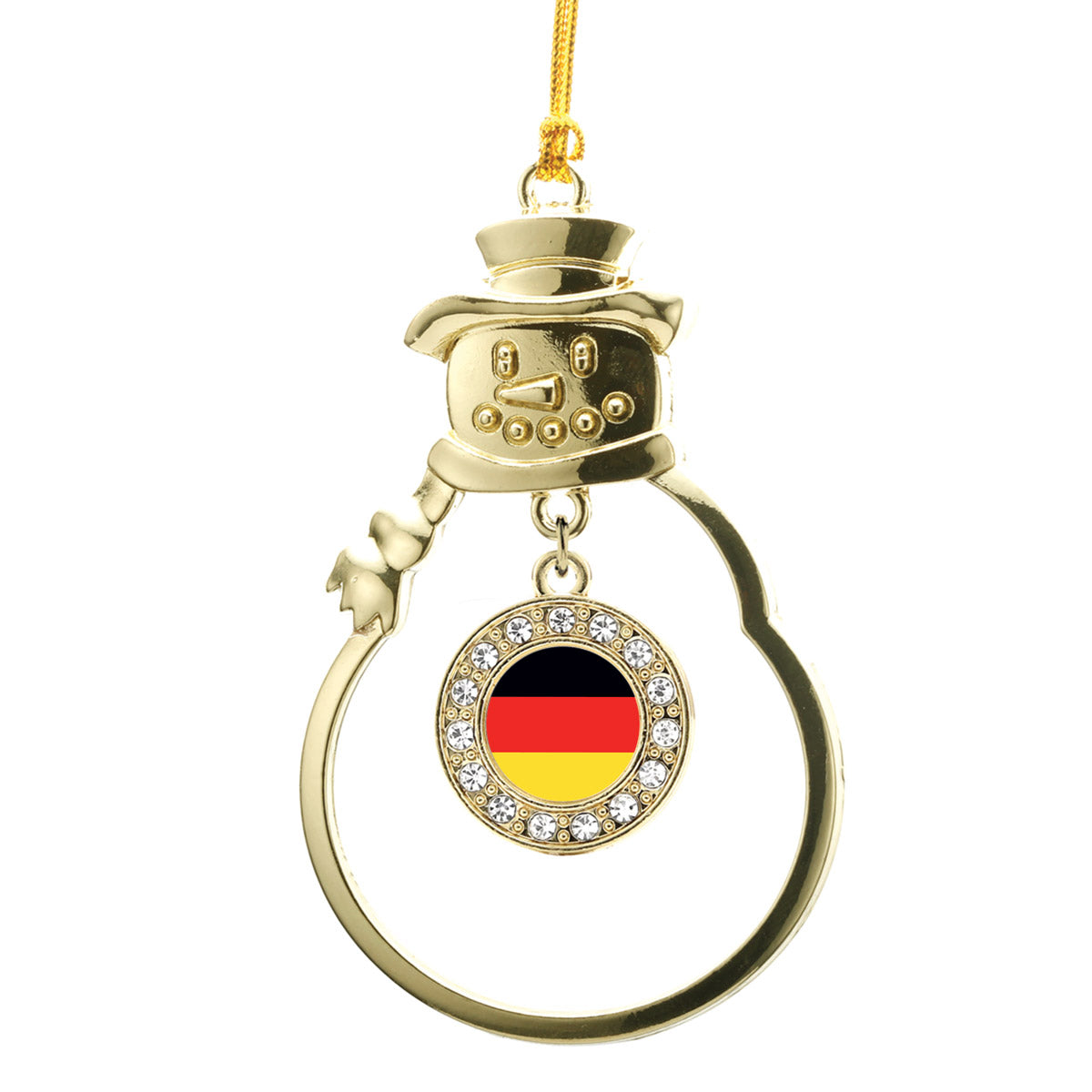 Our sparkling snowman ornament, equipped with a stylish silver rope and the German Flag circle charm, is crafted from white metal with a gold plated finish and accented with cubic zirconia stones.