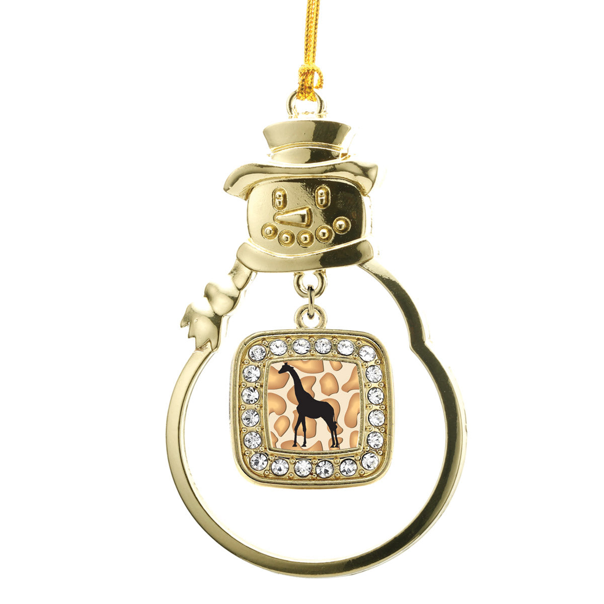 Our sparkling snowman ornament, equipped with a stylish silver rope and the Giraffe Silhouette square charm, is crafted from white metal with a gold plated finish and accented with cubic zirconia stones.