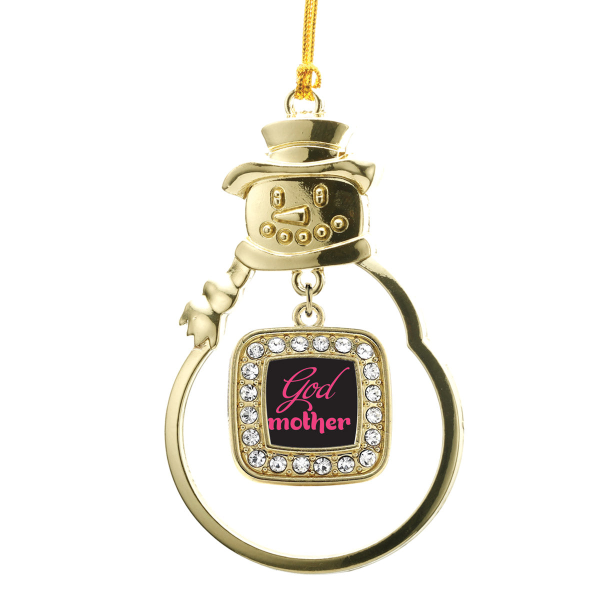 Our sparkling snowman ornament, equipped with a stylish silver rope and the Godmother square charm, is crafted from white metal with a gold plated finish and accented with cubic zirconia stones.
