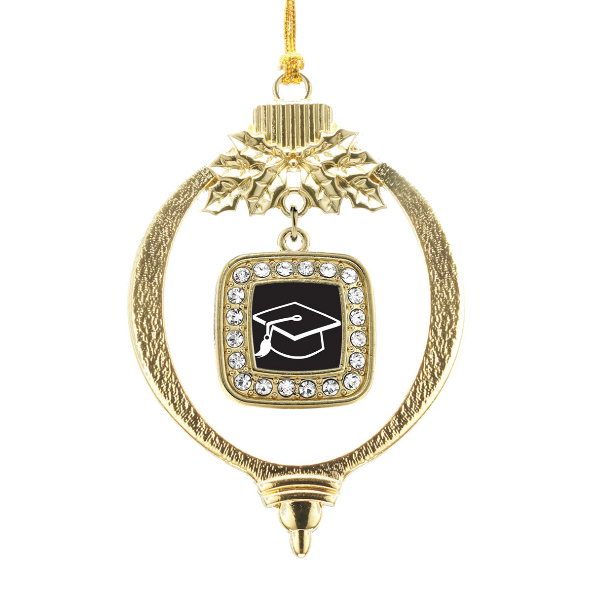 Our sparkling holiday ornament, equipped with a stylish silver rope and the Graduation square charm, is crafted from white metal with a gold plated finish and accented with cubic zirconia stones.