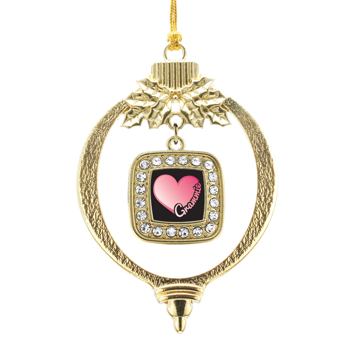 Our sparkling holiday ornament, equipped with a stylish silver rope and the Grammie square charm, is crafted from white metal with a gold plated finish and accented with cubic zirconia stones.