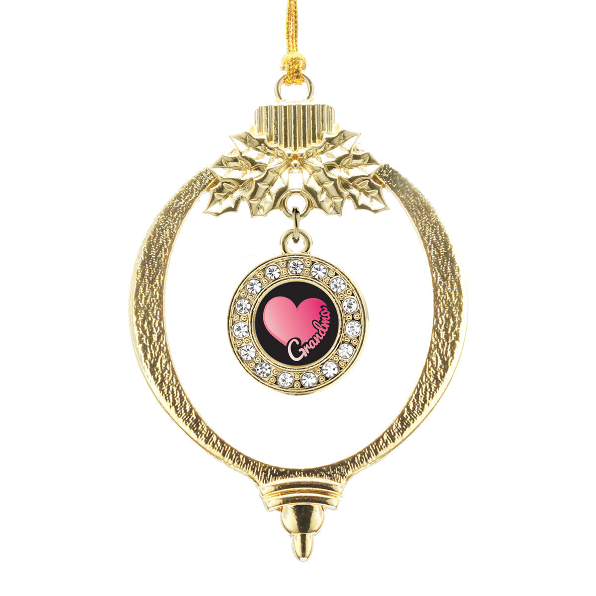 Our sparkling holiday ornament, equipped with a stylish silver rope and the Grandma circle charm, is crafted from white metal with a gold plated finish and accented with cubic zirconia stones.