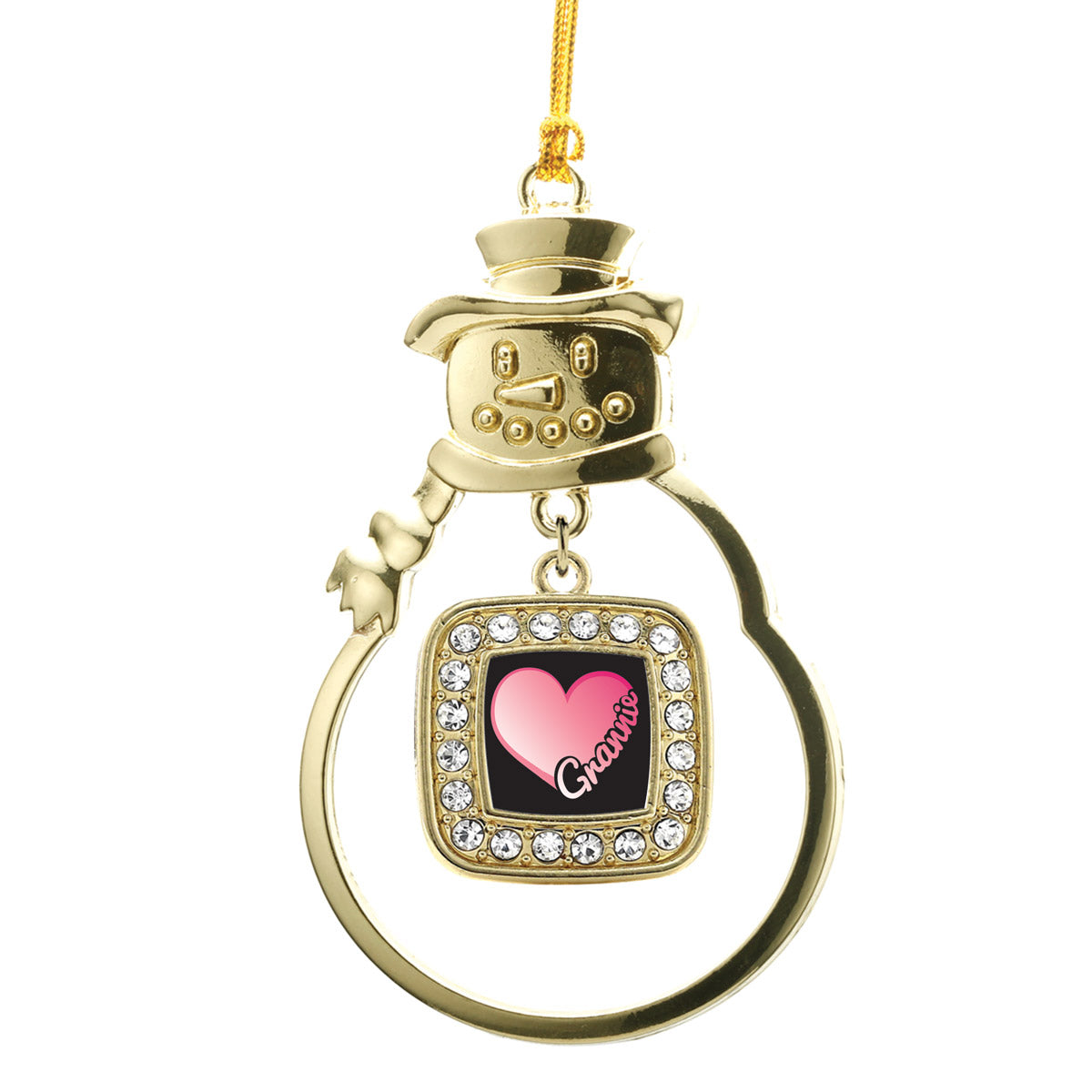Our sparkling snowman ornament, equipped with a stylish silver rope and the Grannie square charm, is crafted from white metal with a gold plated finish and accented with cubic zirconia stones.