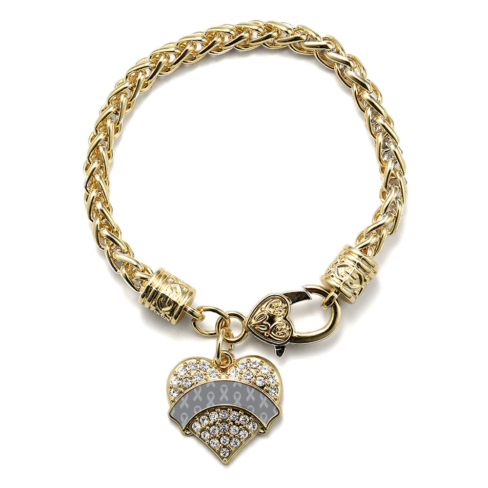 Our sparkling braided bracelet, equipped with a stylish lobster claw clasp and the Gray Ribbon Support pave heart charm, is crafted from white metal with a gold plated finish and accented with cubic zirconia stones.