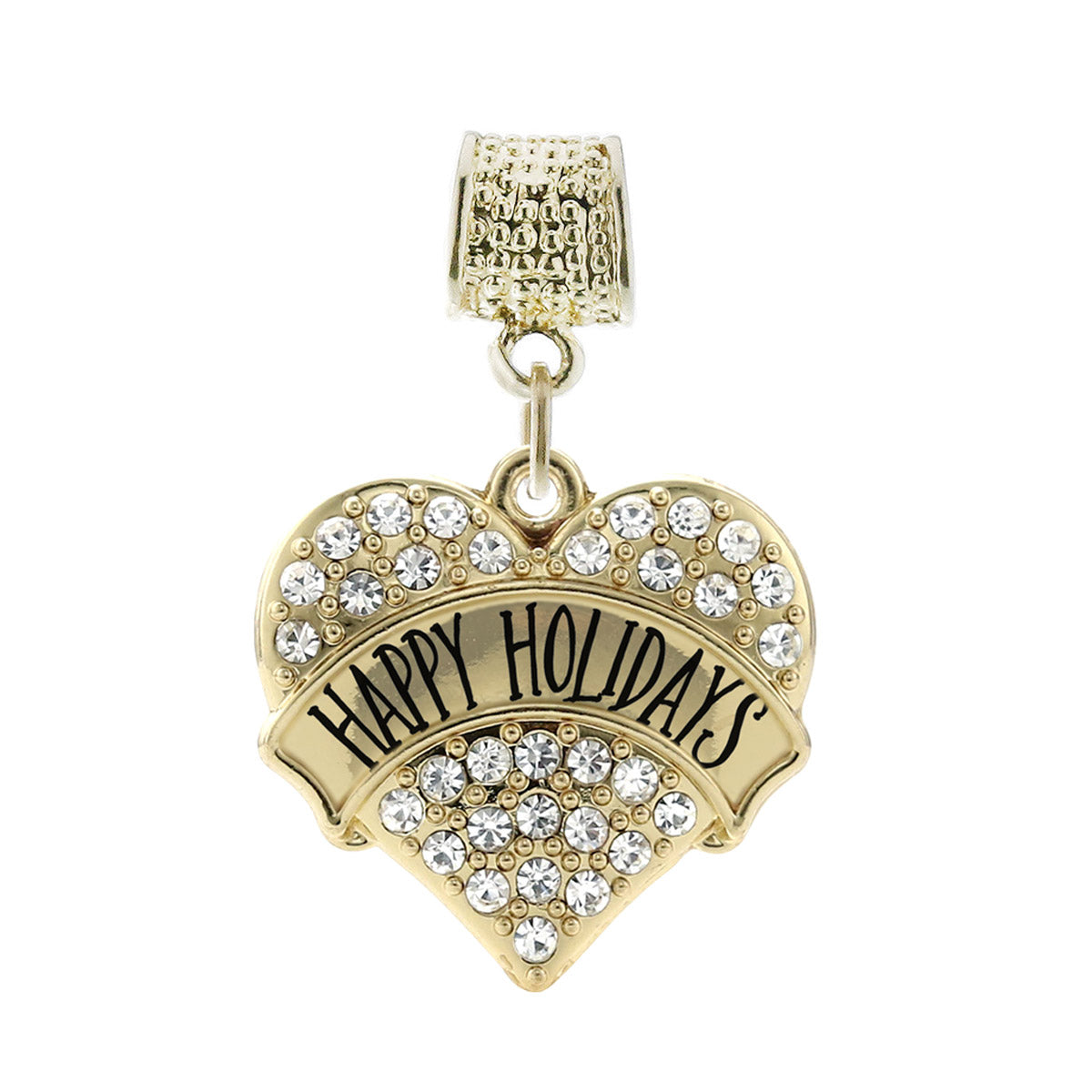 Our sparkling memory charm, equipped with a stylish charm attachment ring and the Happy Holidays pave heart charm, is crafted from white metal with a gold plated finish and accented with cubic zirconia stones.