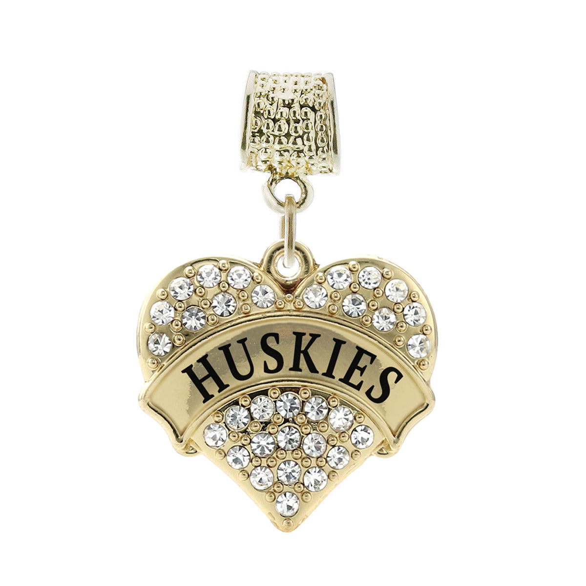 Our sparkling memory charm, equipped with a stylish charm attachment ring and the Huskies pave heart charm, is crafted from white metal with a gold plated finish and accented with cubic zirconia stones.