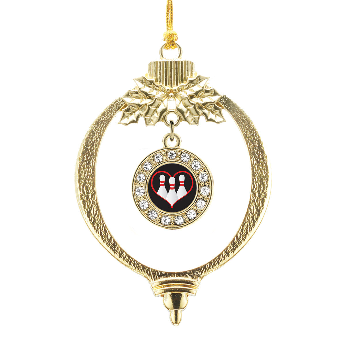 Our sparkling holiday ornament, equipped with a stylish silver rope and the I Heart Bowling circle charm, is crafted from white metal with a gold plated finish and accented with cubic zirconia stones.
