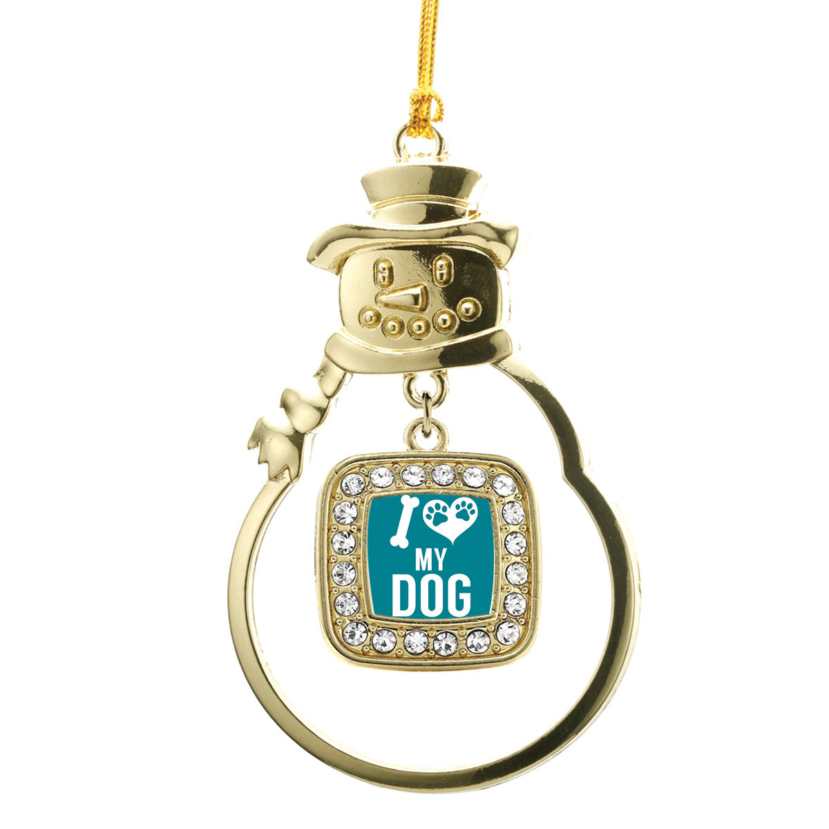 Our sparkling snowman ornament, equipped with a stylish silver rope and the I Love My Dog square charm, is crafted from white metal with a gold plated finish and accented with cubic zirconia stones.