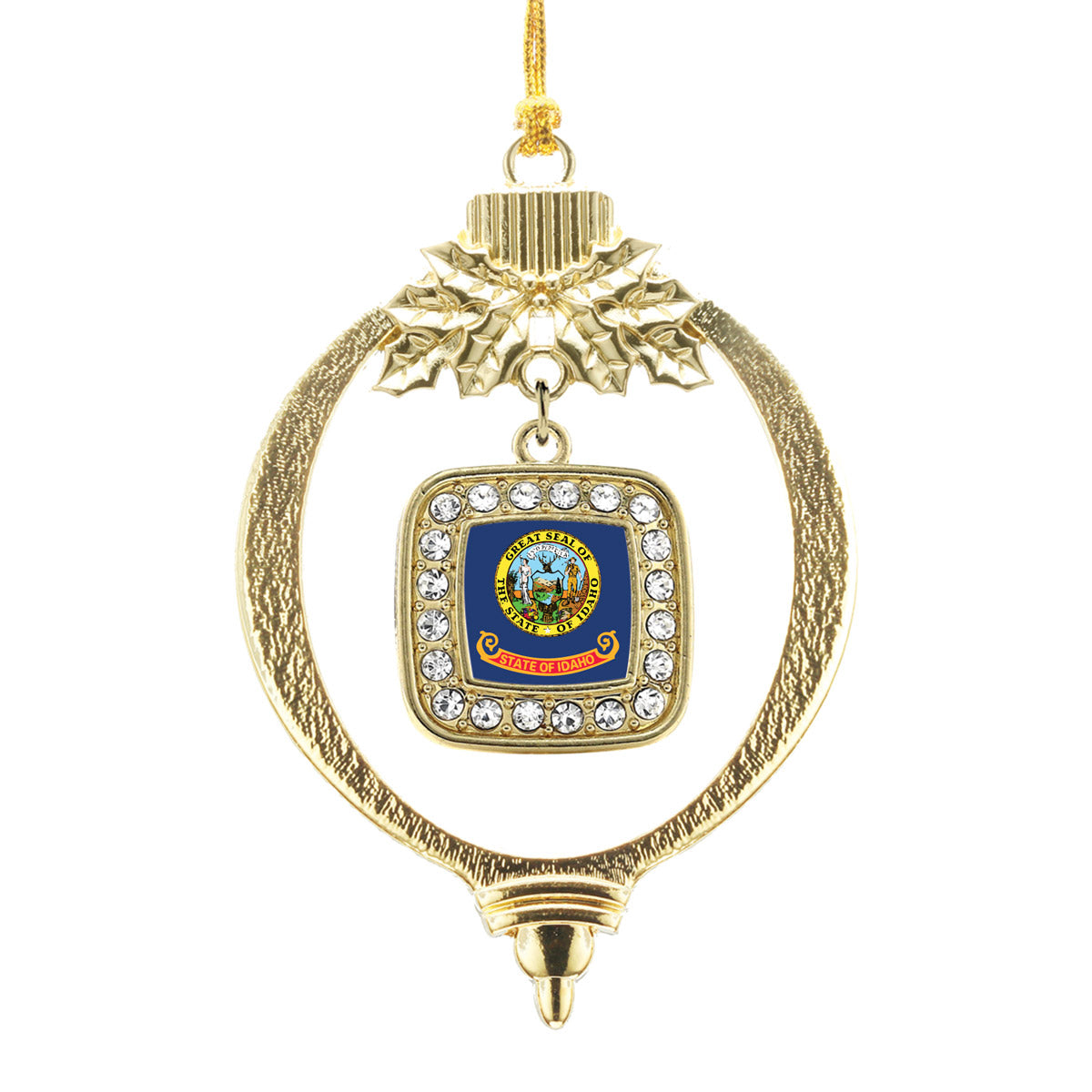 Our sparkling holiday ornament, equipped with a stylish silver rope and the Idaho Flag square charm, is crafted from white metal with a gold plated finish and accented with cubic zirconia stones.