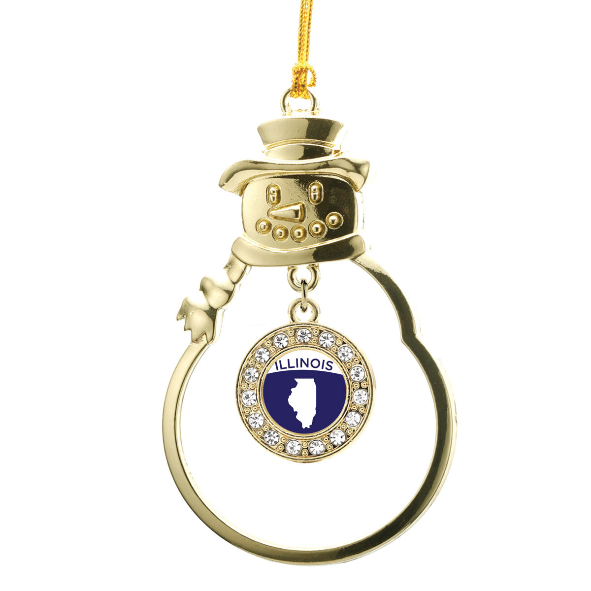 Our sparkling snowman ornament, equipped with a stylish silver rope and the Illinois Outline circle charm, is crafted from white metal with a gold plated finish and accented with cubic zirconia stones.