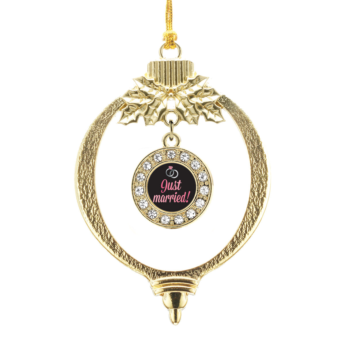 Our sparkling holiday ornament, equipped with a stylish silver rope and the Just Married circle charm, is crafted from white metal with a gold plated finish and accented with cubic zirconia stones.