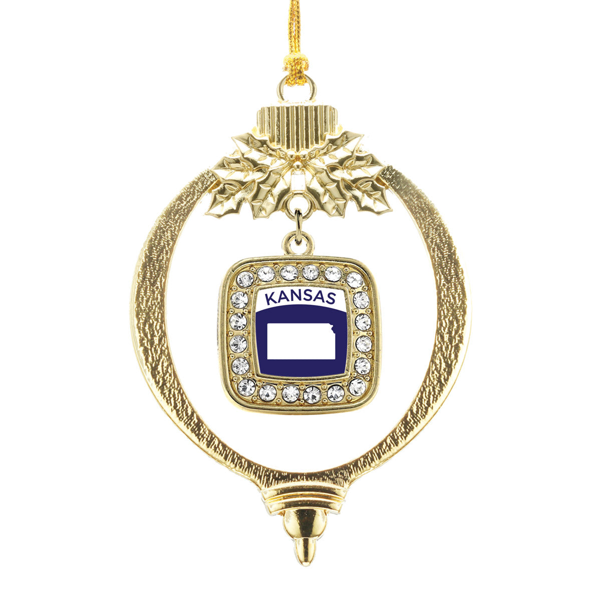 Our sparkling holiday ornament, equipped with a stylish silver rope and the Kansas Outline square charm, is crafted from white metal with a gold plated finish and accented with cubic zirconia stones.