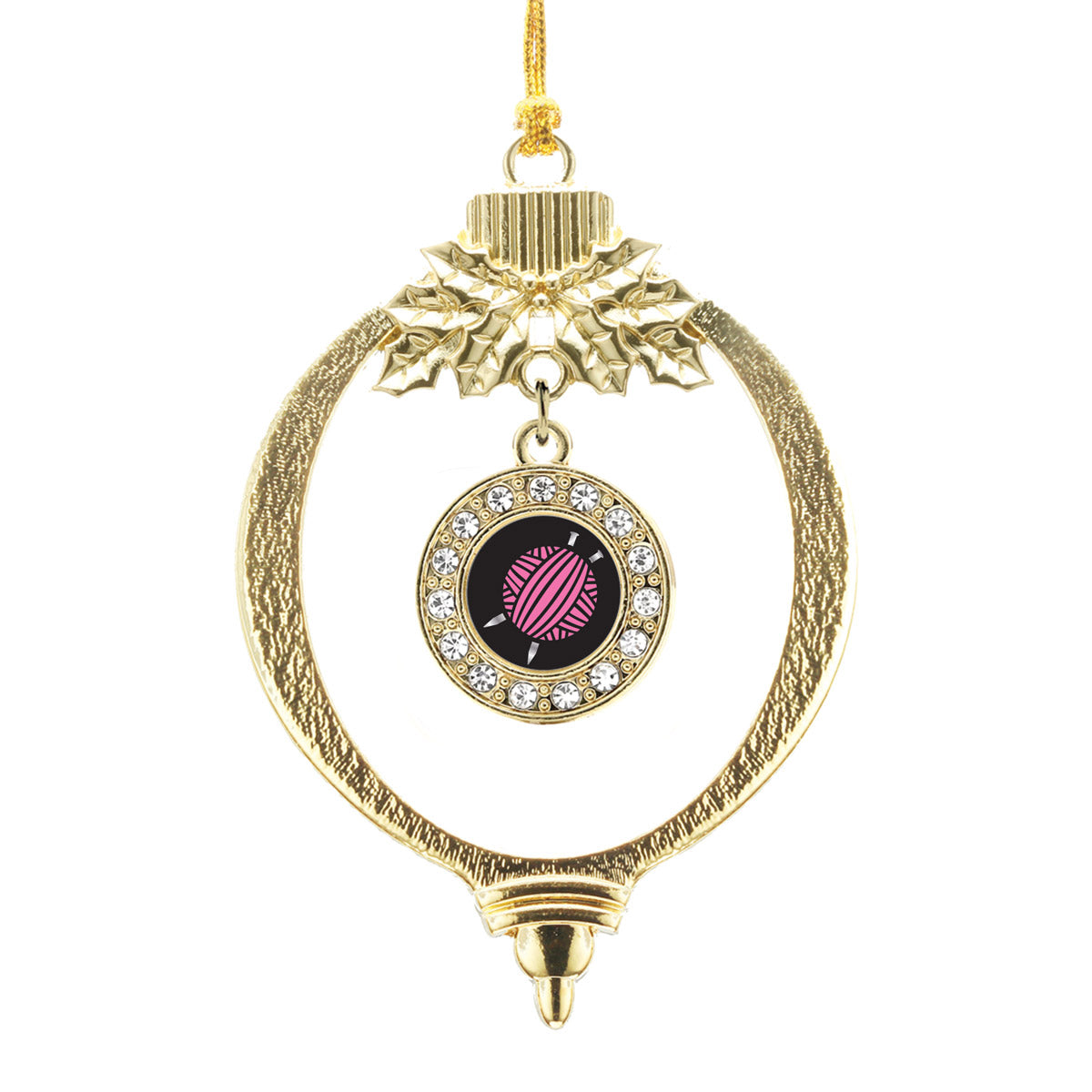 Our sparkling holiday ornament, equipped with a stylish silver rope and the Knitting Needles circle charm, is crafted from white metal with a gold plated finish and accented with cubic zirconia stones.