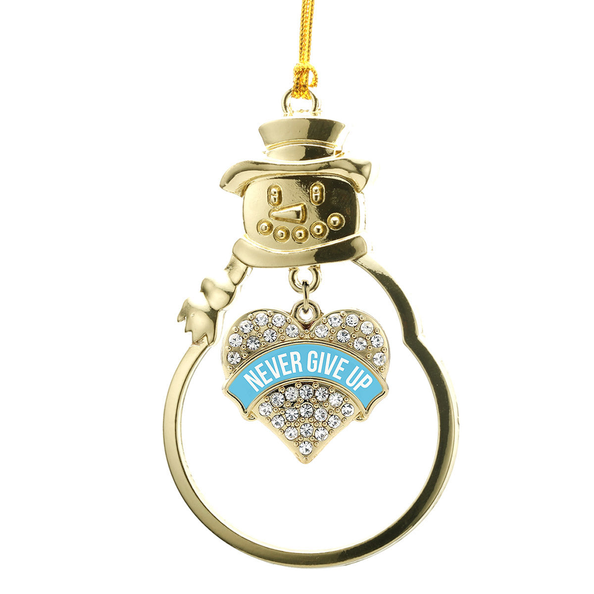 Gold Light Blue Banner Never Give Up Pave Heart Charm Snowman Ornament