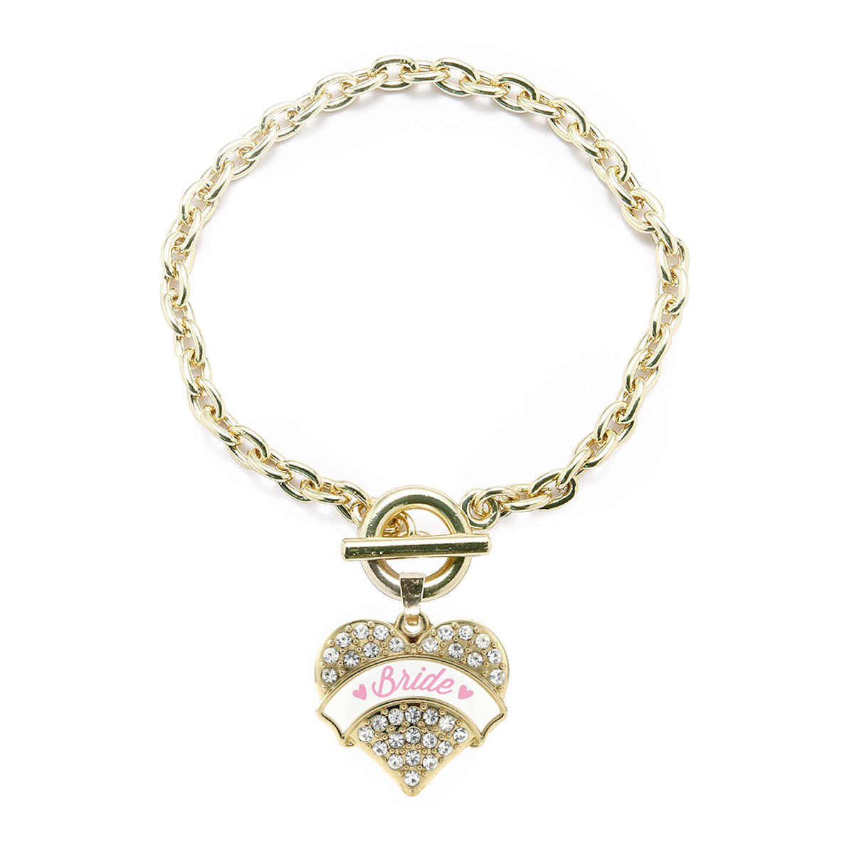 Our sparkling toggle bracelet, equipped with a stylish toggle clasp and the Light Pink Bride pave heart charm, is crafted from white metal with a gold plated finish and accented with cubic zirconia stones.